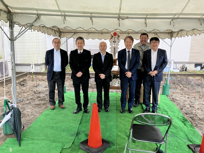 この度、その隣にGX仕様【断熱等級6、BEI 0.65】にて新たにシン・WB宿泊体感施設「GXソレア」の建設をすることとなり4月1日にあいにくの雨でしたが地鎮祭を執り行いました。