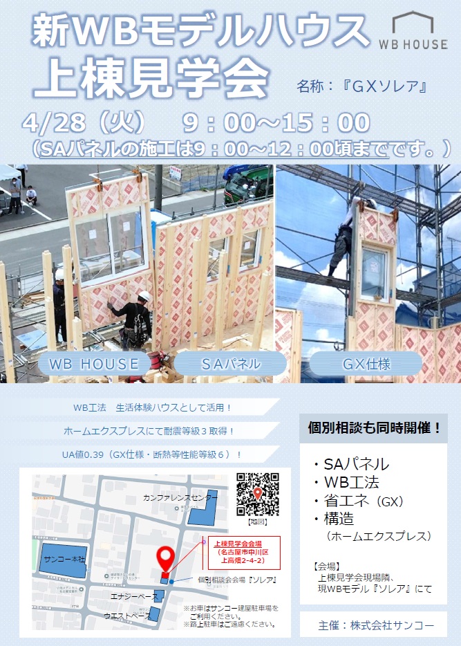 WB宿泊体感施設「GXソレア」上棟見学会(4/28)のお知らせ