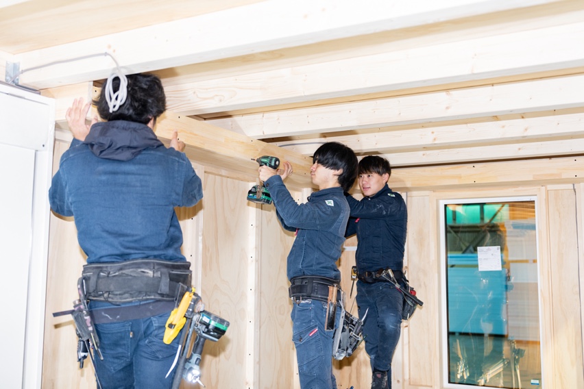 日進工場は、東名高速名古屋インターから車で約 10 分と遠隔地移動にも便利な場所に位置し、敷 地 1650 坪、工場内も 600 坪と十分なスペースで当社の社員大工が責任をもって施工生産いたし ます。